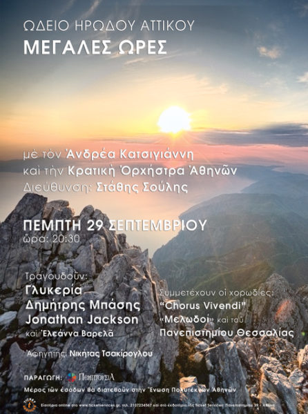 Ένα πολυδιάστατο μουσικό έργο, μία πολυπρόσωπη μουσική τριλογία, μια μεγάλη παραγωγή θα πραγματοποιηθεί στο Ωδείο Ηρώδου Αττικού, την Πέμπτη 29 Σεπτεμβρίου, στις 20:30: Ο συνθέτης Ανδρέας Κατσιγιάννης σε συνεργασία με την Κρατική Ορχήστρα Αθηνών θα παρουσιάσουν αποσπάσματα από την τριλογία του συνθέτη, «ΜΕΓΑΛΕΣ ΩΡΕΣ».